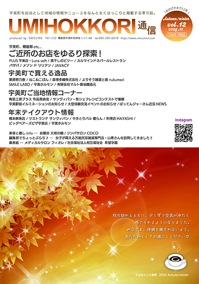 うみコンサルでは、宇美町を中心とした糟屋郡や福岡市近郊の情報や、地元のほっこりする情報を掲載した地域情報誌「うみほっこり通信」を年に2〜3回で発行しております。